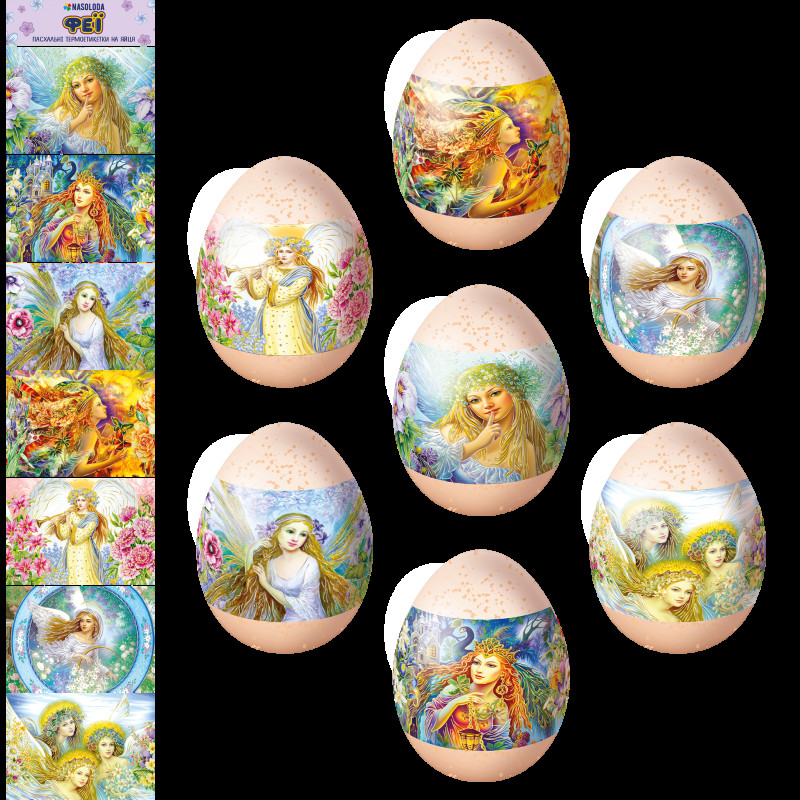 Стрічка д/яєць "Феї" бренду Nasoloda — товар, який допомагає швидко оформити великодню випічку та яйця без зайвих зусиль. Термострічка дає змогу швидко оформити яйця до Великодня: достатньо надіти стрічку та опустити яйце в гарячу воду. Дизайн Феї робить декор охайним, яскравим і зручним для домашнього використання.