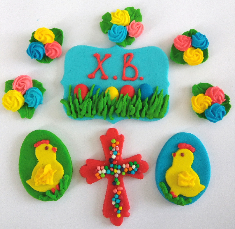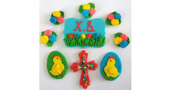 Кондитерські прикраси Набір Яєчка та веселка . Готовий набір кондитерських фігурок для прикрашання великодніх пасок. В набір входить: п'ять маків, три листочки, курчатко з яєчком, ХВ, дві верби. Створюйте цікавий дизайн для великодніх пасок.
