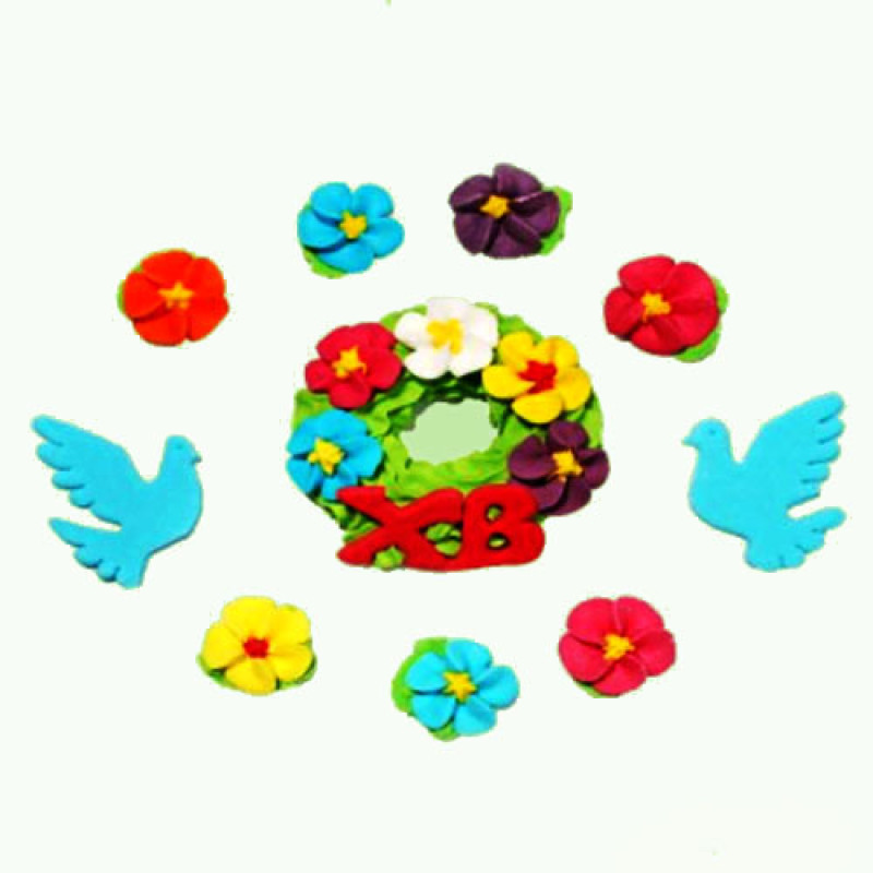 Віночок із голубами – прикраса завдяки тому, що вже готова до застосування, дозволить швидко додати яскравих фарб святковому столу. Цей великодній набір із цікавих кондитерських фігурок додасть вишуканої краси Вашим кулінарним шедеврам. Дозволить по-новому прикрасити паски або цілу святкову композицію. Ці оригінальні їстівні фігурки виготовлені із цукрової мастики із застосуванням натуральних барвників.
